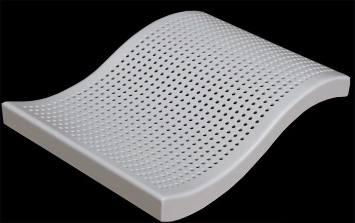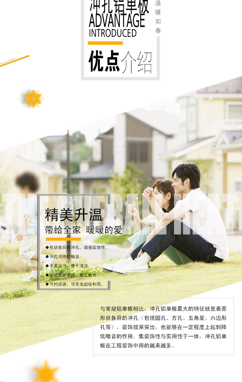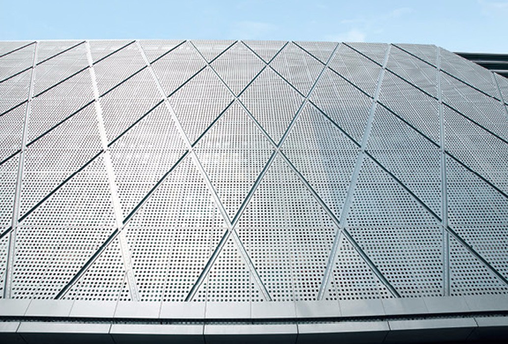 与常规铝单板相比,冲孔铝单板的特征就是表面形状各异的冲孔(包括圆孔、方孔、五角星、六边形孔等),装饰效果突出,也能够在一定程度上起到降低噪音的作用。集装饰性与实用性于一体,冲孔铝单板在工程装饰中使用的越来越多。氟碳冲孔铝单板特点: